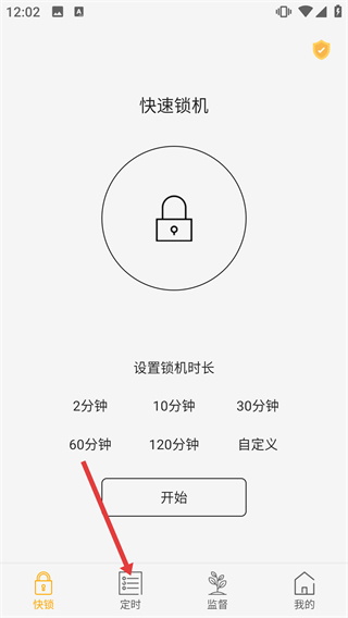1、在【快速鎖機(jī)】界面選擇所需的鎖機(jī)時(shí)長(zhǎng)后,點(diǎn)擊底部的【定時(shí)】按鈕,即可切換至定時(shí)鎖機(jī)功能頁(yè)面。