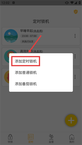 3、點(diǎn)擊黃色【+】按鈕后彈出操作菜單,選擇其中的【添加定時(shí)鎖機(jī)】選項(xiàng),就能進(jìn)入定時(shí)鎖機(jī)的配置頁(yè)面。