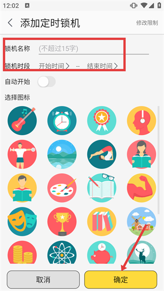 4、在【添加定時(shí)鎖機(jī)】頁(yè)面,填寫不超過(guò)15字的【鎖機(jī)名稱】并設(shè)置鎖機(jī)時(shí)段,選好圖標(biāo)后點(diǎn)擊【確定】完成配置。