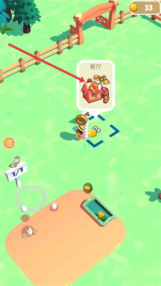 1、點(diǎn)擊指向的【餐廳】建筑,可進(jìn)入其功能界面,同時(shí)留意右上角【33】的金幣數(shù)值,該資源后續(xù)可用于解鎖相關(guān)內(nèi)容。