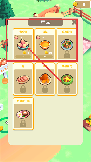 2、進(jìn)入【產(chǎn)品】界面后,優(yōu)先選擇【煮雞蛋-1/5】這類已解鎖的菜品制作,消耗對應(yīng)材料并等待對應(yīng)時(shí)長,積累菜品資源。
