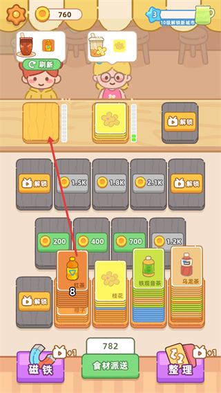 3、收集卡牌的核心玩法,通過完成各類訂單需求解鎖更多食材與奶茶款式,逐步打造夢想中的特色奶茶鋪。