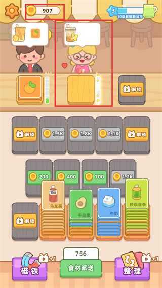 3、顧客需求滿足后,金幣增長至907,繼續(xù)點擊【食材派送】處理食材,滿足新需求。