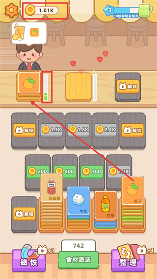 4、派送橙子后,金幣達(dá)到1.01K,持續(xù)供相對于應(yīng)的食材后,可獲得金幣獎勵。