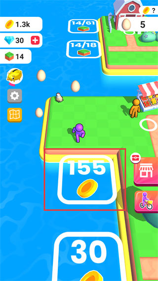 1、滑動(dòng)屏幕操控角色,觸碰紅色框內(nèi)【155】金幣標(biāo)識區(qū)域,獲得一塊地皮。