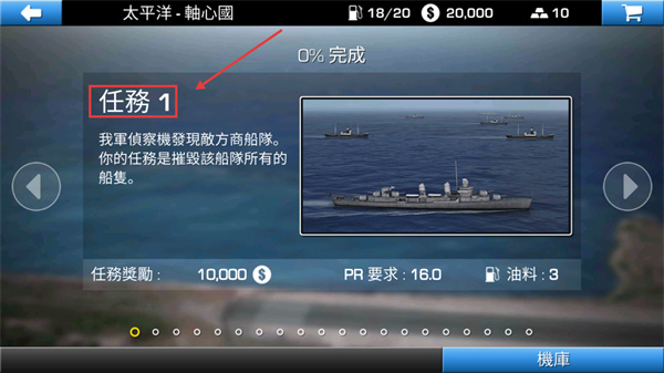 1、在【太平洋-軸心國(guó)】的【任務(wù)1】中,目標(biāo)是摧毀該海域所有船艦,完成后可獲得【10,000-$】的任務(wù)獎(jiǎng)勵(lì)。