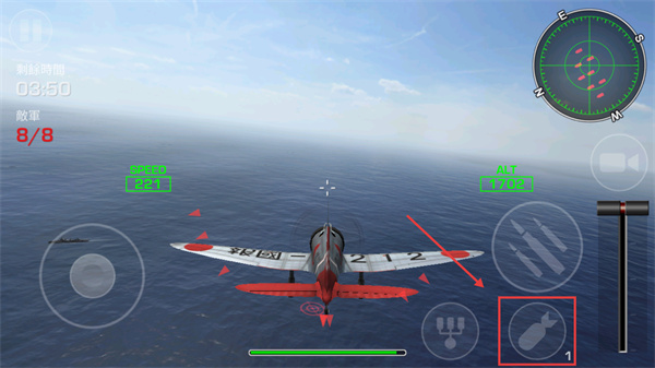 3、接近敵方船艦后,點(diǎn)擊右側(cè)炸彈按鈕投放炸彈,炸毀目標(biāo)。