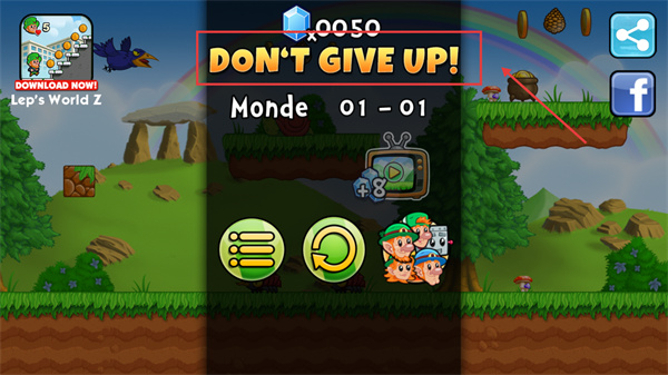 4、關卡失敗后出現(xiàn)【DON'T-GIVE-UP!】提示,可選擇重新挑戰(zhàn),快速積累經(jīng)驗提升通關效率。