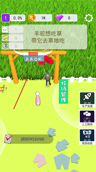 1、初始階段按照提示,將羊駝移動(dòng)到草地區(qū)域,讓其進(jìn)食,推進(jìn)養(yǎng)殖流程。