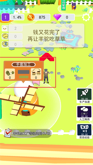 4、當(dāng)金幣消耗完后,再次引導(dǎo)羊駝進(jìn)食,重復(fù)“養(yǎng)殖-收毛-加工”的循環(huán),同時(shí)解鎖手套加工等更多生產(chǎn)功能。