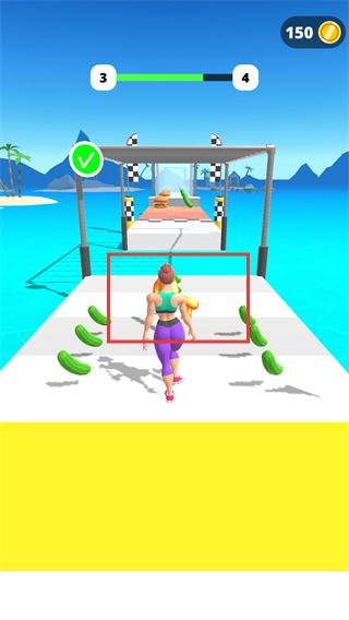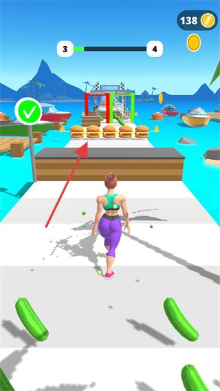 2、關(guān)卡中操控角色向【漢堡】區(qū)域移動,同時拾取路上的【黃瓜】,推進(jìn)瘦身進(jìn)度條(當(dāng)前【3-4】)。