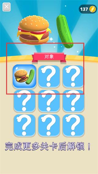 4、在【對象】界面,當(dāng)前解鎖【漢堡-黃瓜】組合,提示【完成更多關(guān)卡后解鎖!】,繼續(xù)通關(guān)解鎖更多內(nèi)容。