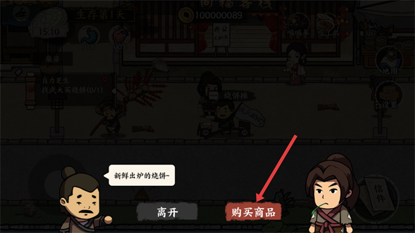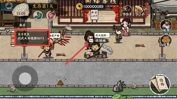 1、在【生存第1天】接取【自力更生-找武大買燒餅(0/1)】任務(wù),找到【武大-燒餅攤】NPC推進流程。