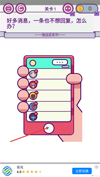 1、關(guān)卡1中【好多消息-一條也不想回復(fù)】的問(wèn)題,跟隨紅色箭頭點(diǎn)擊手機(jī)上的對(duì)應(yīng)按鈕,就能完成該關(guān)卡的指定任務(wù)。