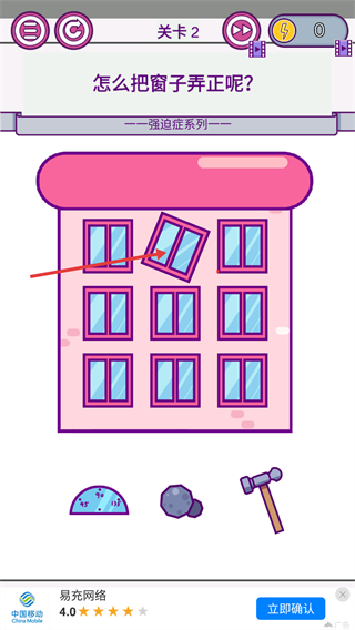 2、關(guān)卡2要解決【怎么把窗子弄正】的問(wèn)題,跟隨箭頭操作,將對(duì)應(yīng)窗子旋轉(zhuǎn)到正確位置,即可達(dá)成該關(guān)卡目標(biāo)。