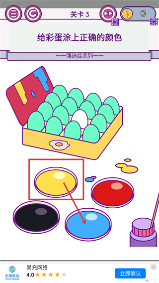 3、關(guān)卡3需完成【給彩蛋涂上正確的顏色】的任務(wù),將黃色顏料跟隨紅色箭頭移動(dòng)到藍(lán)色顏料上,變?yōu)榍嗌伭稀?