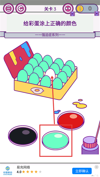 4、關(guān)卡3繼續(xù)完成【給彩蛋涂上正確的顏色】的任務(wù),跟隨紅色箭頭選取青色顏料,移動(dòng)到彩蛋盒內(nèi)的白色彩蛋上完成操作。