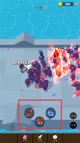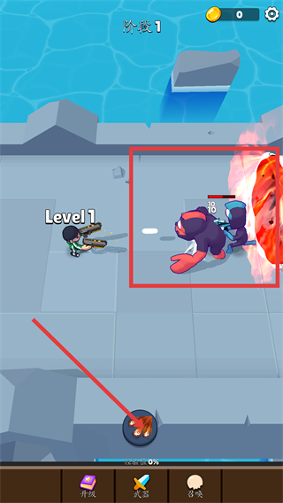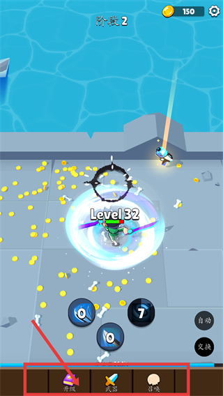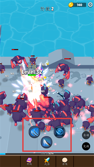 2、階段提升后敵人變強(qiáng),點(diǎn)擊【技能按鈕】釋放酷炫大招,高效清敵積累金幣,為后續(xù)強(qiáng)化武器做準(zhǔn)備。